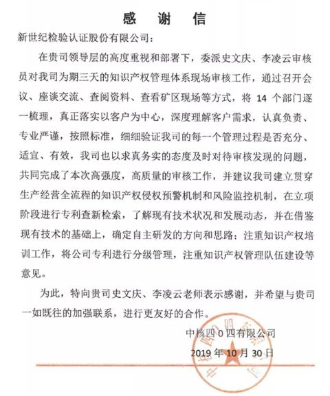 四O四對認證審核工作高度重視、積極配合,順利通過知識產(chǎn)權(quán)管理體系的認證審核,證書認證范圍是:與核燃料的加工,核設施退役相關(guān)的知識產(chǎn)權(quán)管理。在征得公司同意之后,BCC將四O四作為優(yōu)秀貫標案例向國家知識產(chǎn)權(quán)局進行了推薦。