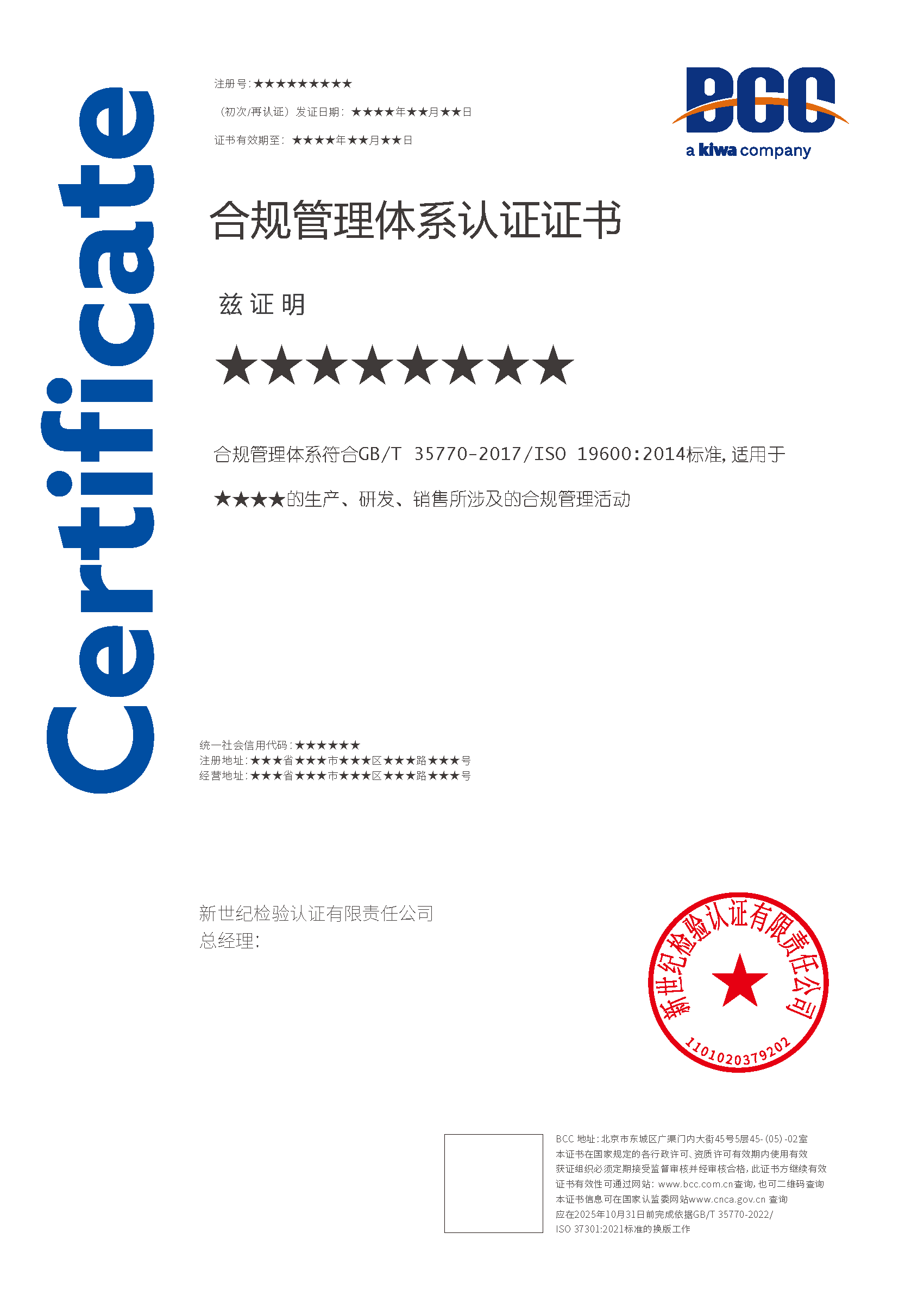 本頁涉及的認(rèn)證服務(wù)中均有對應(yīng)的《認(rèn)證實(shí)施規(guī)則》,BCC擁有其最終解釋權(quán)。任何組織及個人未經(jīng)BCC許可,不得以任何形式全部或部分使用(法律要求除外)認(rèn)證相關(guān)信息。如需獲取相關(guān)實(shí)施規(guī)則請用以下方式聯(lián)系獲?。弘娫挘?10-58579316 郵箱:fwjs@kiwa.cn
