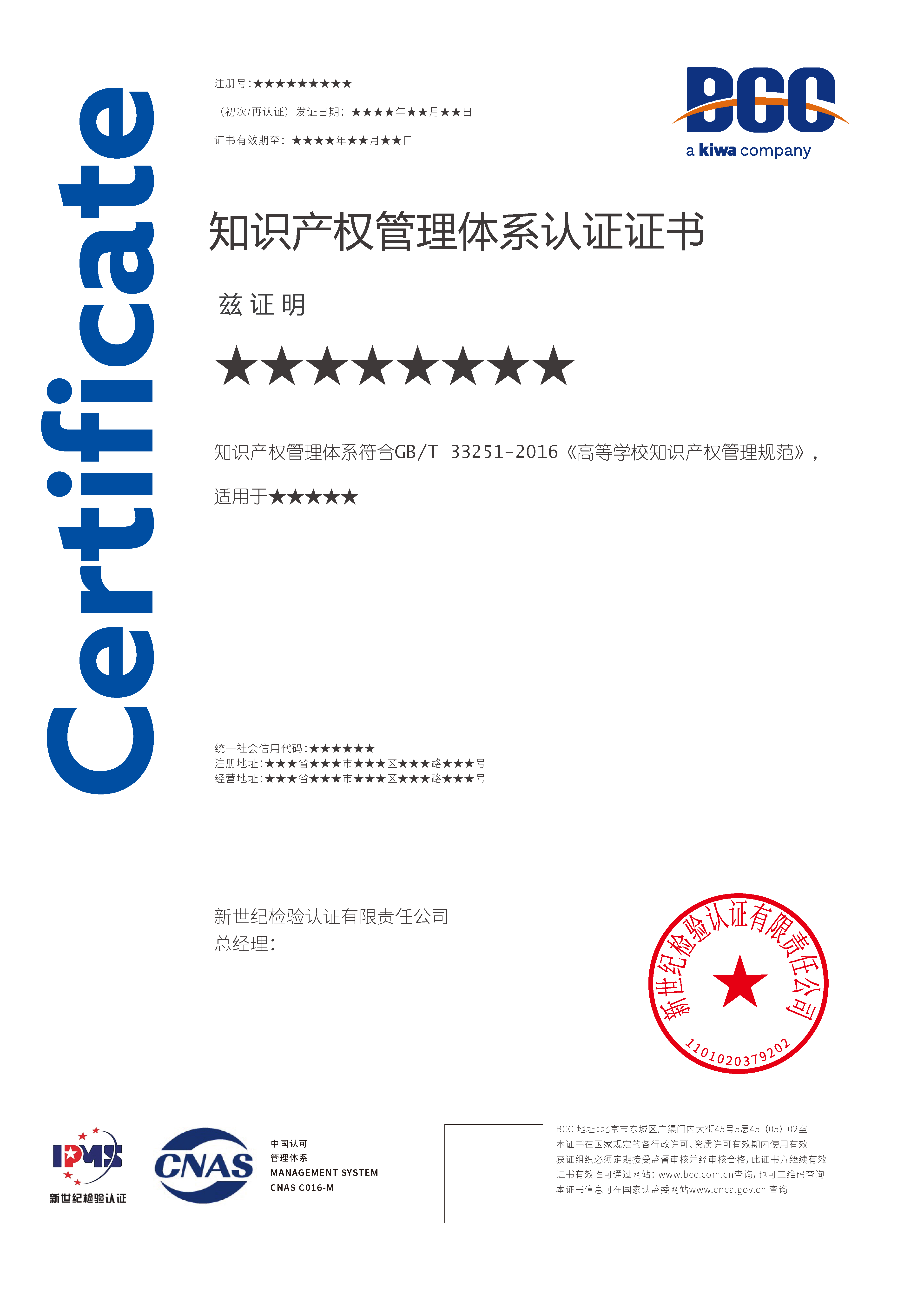 Kiwa BCC是首批獲CNAS認(rèn)可的知識(shí)產(chǎn)權(quán)認(rèn)證機(jī)構(gòu),可為企業(yè)頒發(fā)帶有“CNAS”標(biāo)識(shí)的知識(shí)產(chǎn)權(quán)管理體系認(rèn)證證書(shū)。認(rèn)證所用標(biāo)準(zhǔn)包括:GB/T 29490-2023《企業(yè)知識(shí)產(chǎn)權(quán)合規(guī)管理體系要求》、GB/T33250-2016《科研組織知識(shí)產(chǎn)權(quán)管理規(guī)范》、GB/T33251-2016《高等學(xué)校知識(shí)產(chǎn)權(quán)管理規(guī)范》。