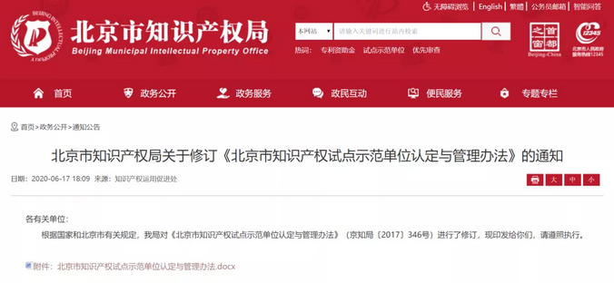 6月17日,為深化實施創(chuàng)新驅動戰(zhàn)略和首都知識產(chǎn)權戰(zhàn)略,進一步規(guī)范知識產(chǎn)權試點示范單位認定與管理工作,北京市知識產(chǎn)權局修訂的《北京市知識產(chǎn)權試點示范單位認定與管理辦法》(京知局〔2020〕171號)正式發(fā)布。