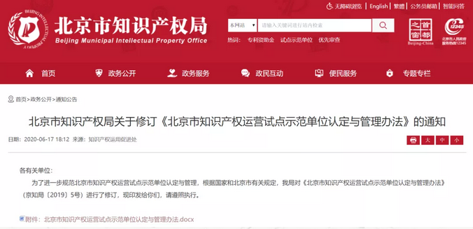 同日,為培育一批知識產(chǎn)權運營能力強、成效好、具有示范效應的知識產(chǎn)權運營機構,發(fā)揮其在北京市知識產(chǎn)權運營體系建設工作中的支撐作用,促進北京市知識產(chǎn)權運營市場發(fā)展,加快全國科技創(chuàng)新中心和知識產(chǎn)權首善之區(qū)建設,北京市知識產(chǎn)權局修訂并發(fā)布《北京市知識產(chǎn)權運營試點示范單位認定與管理辦法》(京知局〔2020〕172號)。