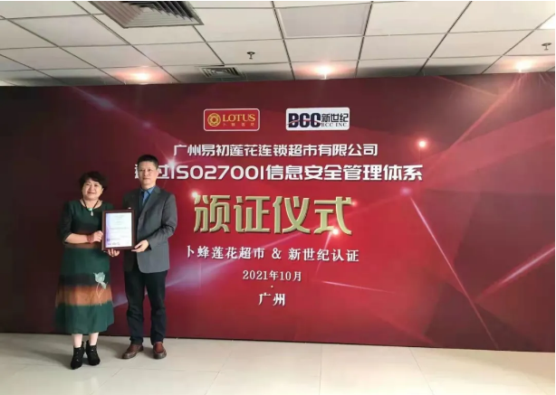 儀式上,李曉杰女士向余嘉璋總監(jiān)頒發(fā)了信息安全管理體系認證證書,并對廣州易初蓮花順利獲得認證表示熱烈祝賀。
