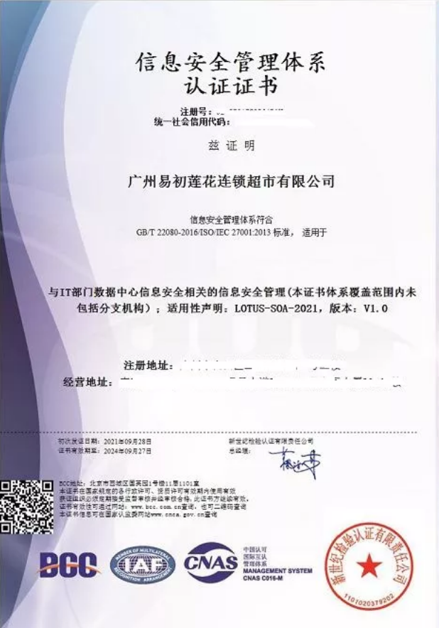 本次獲得BCC頒發(fā)的信息安全管理體系認證證書,標志著廣州易初蓮花在識別信息安全風(fēng)險,減少可能存在的信息安全隱患,提升員工信息安全意識,實現(xiàn)良性發(fā)展方面又邁進一步!