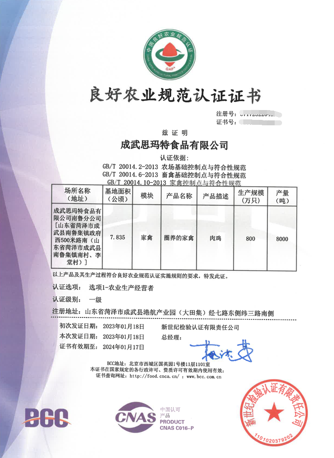 讓雞肉產(chǎn)品更具競(jìng)爭(zhēng)力!成武思瑪特通過BCC實(shí)施的GAP(家禽模塊)認(rèn)證