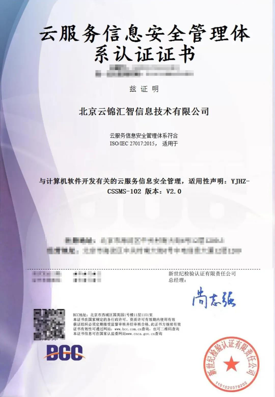 云錦匯智通過 ISO27017云服務(wù)信息安全管理體系認(rèn)證