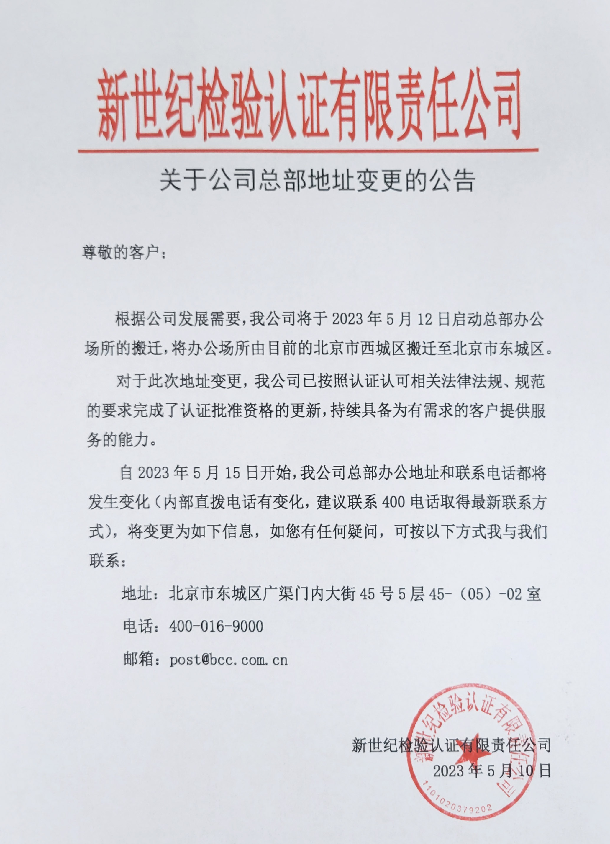 自2023年5月15日開始,我公司總部辦公地址和聯(lián)系電話部將發(fā)生變化(內(nèi)部直撥電話有變化,建議聯(lián)系400電話取得最新聯(lián)系方式),將變更為如下信息,如您有任何疑問,可按以下方式我與我們聯(lián)系: