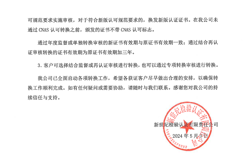 2.2024年6月1日起,我公司不再實(shí)施基于舊版認(rèn)可規(guī)范的審核,開(kāi)始按照新版認(rèn)可規(guī)范要求實(shí)施審核,對(duì)于符合新版認(rèn)可規(guī)范要求的,換發(fā)新版認(rèn)證證書(shū)。在我公司未通過(guò)CNAS認(rèn)可轉(zhuǎn)換之前,頒發(fā)的證書(shū)不帶CNAS認(rèn)可標(biāo)志。