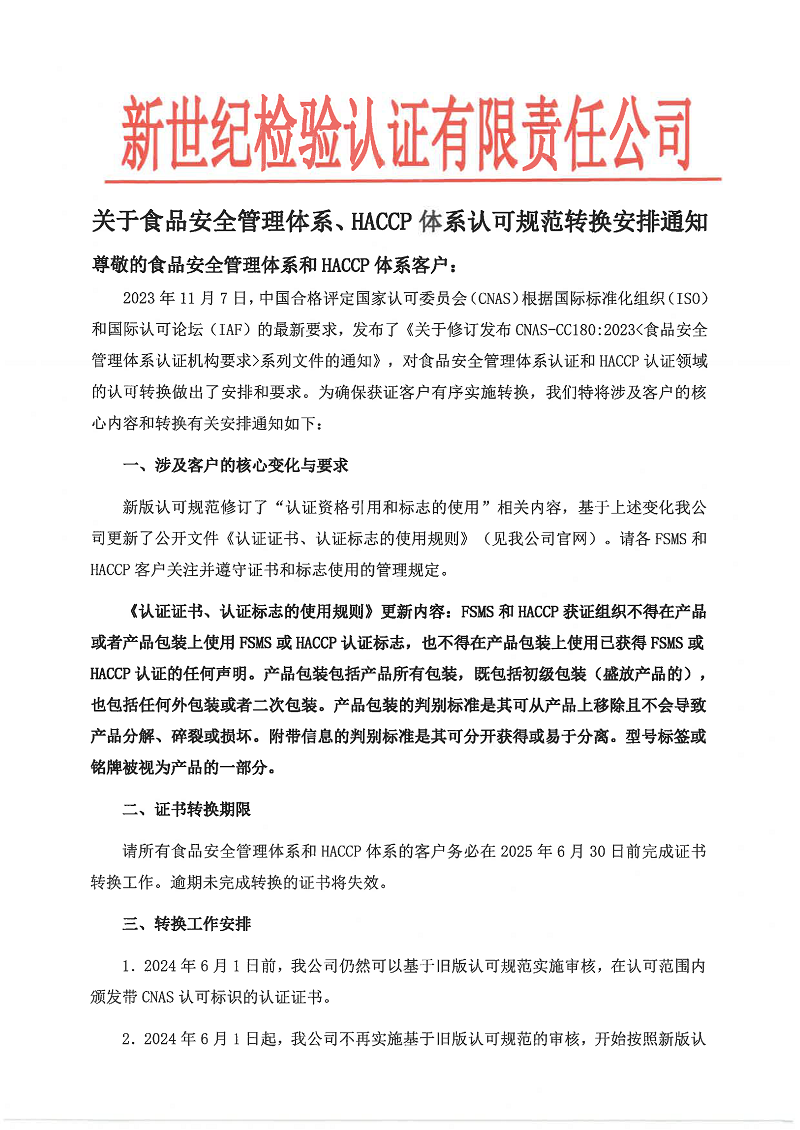 請(qǐng)所有食品安全管理體系和HACCP體系的客戶務(wù)必在2025年6月30日前完成證書(shū)轉(zhuǎn)換工作。逾期未完成轉(zhuǎn)換的證書(shū)將失效。