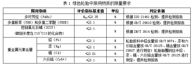 3、環(huán)境屬性。參照已發(fā)布并實施的《輪胎中限用物質(zhì)的限量要求》國家標(biāo)準(zhǔn),對輪胎胎面、胎側(cè)、胎圈(除鋼絲以外部分)、三角膠、內(nèi)襯層、內(nèi)胎、墊帶、胎圈鋼絲等各部位的多環(huán)芳烴(PAHs)、重金屬(鉛、汞、鎘、六價鉻)、短鏈氯化石蠟(SCCP)、多溴聯(lián)苯(PBB)和多溴二苯醚(PBDE)等限用物質(zhì)提出了要求,具體評價指標(biāo)基準(zhǔn)值及判定依據(jù)詳見表1。